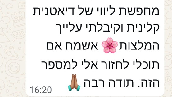 בתהליך לאורח חיים בריא אני מביאה ידע, תמיכה, זמינות, אתם צריכים לבוא מחויבים לתהליך, ולקחת אחריות על השינוי, כי בלעדיכם זה לא יקרה.